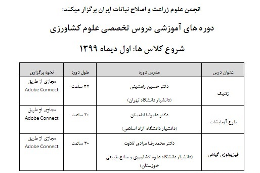 برگزاری دوره های آموزشی دروس تخصصی علوم کشاورزی - دانشکده علوم و مهندسی کشاورزی
