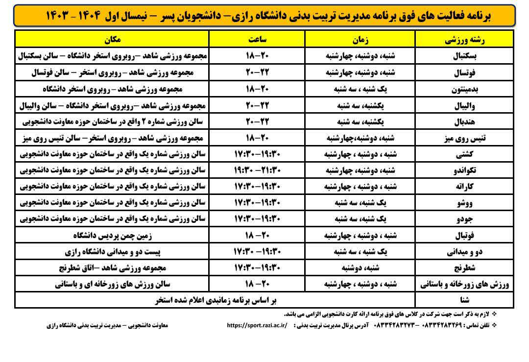 کلاس های فوق برنامه ورزشی دانشگاه رازی - نیمسال اول 1404-1403