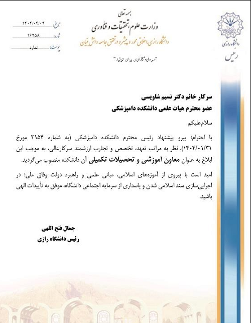 انتصاب سرکار خانم دکتر نسیم شاویسی به عنوان معاون آموزشی و تحصیلات تکمیلی دانشکده دامپزشکی - دانشکده دامپزشکی