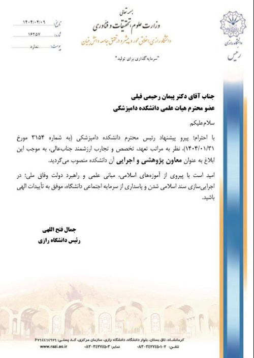 طی صدور حکمی از سوی رئیس دانشگاه جناب آقای دکتر پیمان رحیمی به عنوان معاون پژوهشی و اجرایی دانشکده دامپزشکی منصوب شد.
