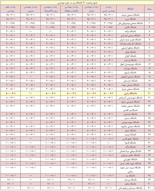 معاون پژوهش و فناوری دانشگاه با اشاره به اینکه امسال 1182 دانشگاه در سراسر جهان در در این رتبه‌بندی حضور دارند، افزود: 41 دانشگاه از کشور ایران شامل دانشگاه‌های صنعتی شریف، تبریز، صنعتی نوشیروانی بابل، کاشان، مراغه، صنعتی امیرکبیر، علم و صنعت ایران، آزاد اسلامی واحد نجف‌آباد، محقق اردبیلی، تهران، گیلان، لرستان، شهید چمران اهواز، شهرکرد، یاسوج، صنعتی اصفهان، کردستان، صنعتی سهند، صنعتی شیراز، رازی، شهید مدنی آذربایجان، فردوسی مشهد، صنعتی خواجه نصیرالدین طوسی، مازندران، سمنان، شهید بهشتی، صنعتی شاهرود، شیراز، ارومیه، خلیج فارس، الزهرا (س)، اراک، بوعلی سینا، حکیم سبزواری، خوارزمی، شهید باهنر کرمان، تربیت معلم شهید رجایی، یزد، بیرجند، شاهد، سیستان و بلوچستان موفق شده‌اند در جمع برترین دانشگاه‌­های جهان در حوزه مهندسی قرار گیرند.