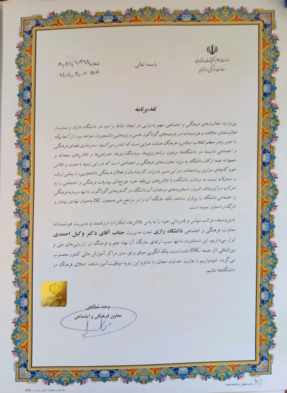 در بخشی از این اجلاس، از دکتر «وکیل احمدی»، معاون فرهنگی و اجتماعی دانشگاه رازی، بهپاس تلاشها و ابتکارات ارزشمند، از سوی دکتر «وحید شالچی»، معاون فرهنگی و اجتماعی وزارت علوم، تحقیقات و فناوری تقدیر شد. در بخشی از حکم تقدیرنامه ایشان آمده است: