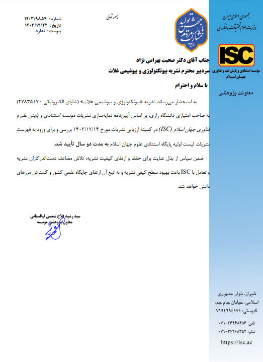 نشریه "بیوتکنولوژی و بیوشیمی غلات" به صاحب امتیازی دانشگاه رازی موفق به اخذ مجوز کمیته ارزیابی نشریات موسسه استنادی و پایش علم و فناوری جهان اسلام (ISC) شد.