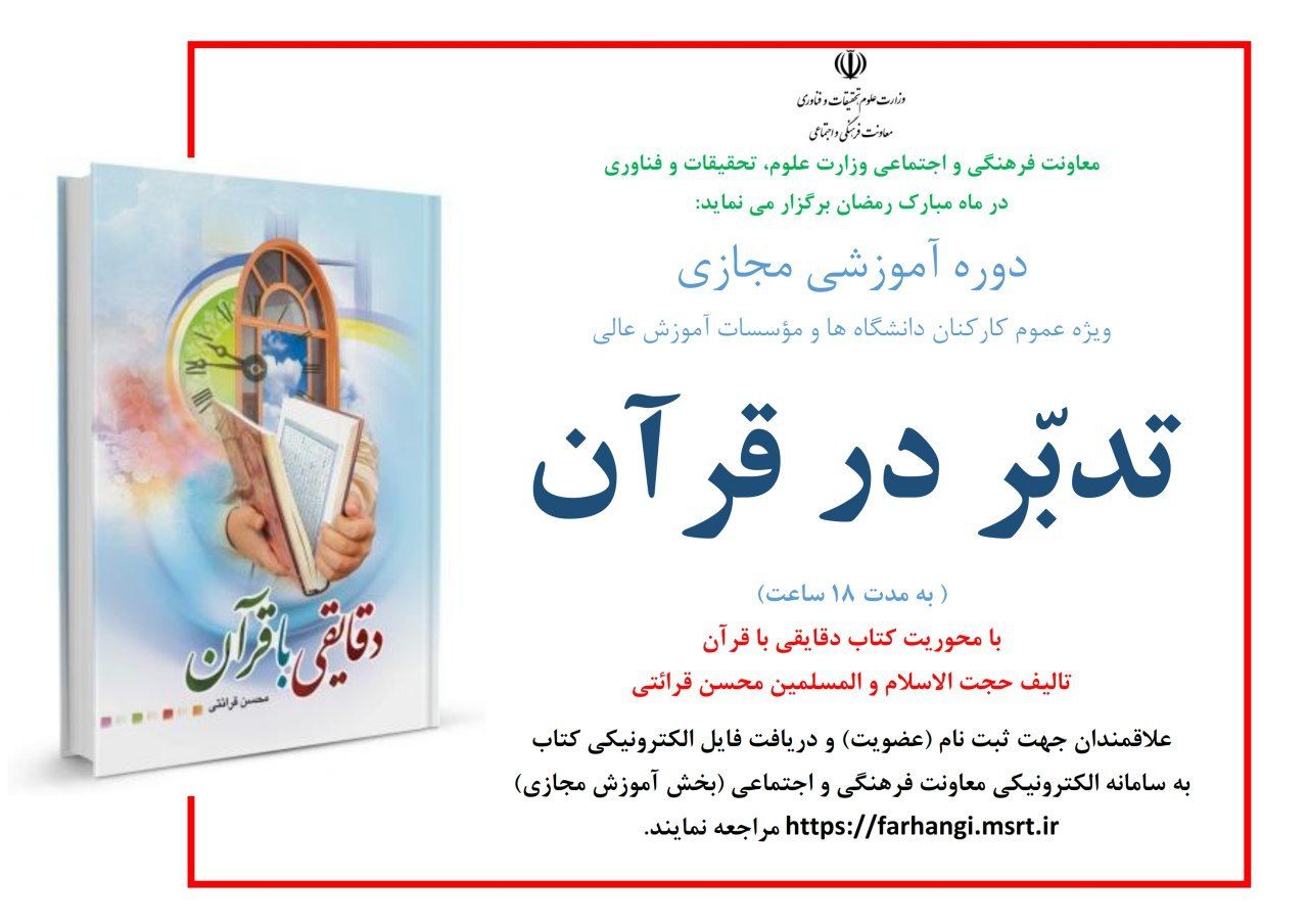 03 05 2020 644 دوره آموزشی «تدبر در قرآن» ویژه کارکنان دانشگاه ها معاونت فرهنگی و اجتماعی وزارت علوم، تحقیقات و فناوری در ماه مبارک رمضان در نظر دارد دوره آموزشی مجازی «تدبّر در قرآن» را با محوریت...