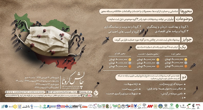 26 04 2020 695 «#چالش_کرونا» «#چالش_کرونا» شامـل: شـناسایی وحمایت از ایـده ها و نیز محصولات و اقـدامات خلاقانه است. هریک از ایده ها می بایست مرتبط با بهداشت، درمان و پیشگیری، مدیریت و سیاستگذاری،...