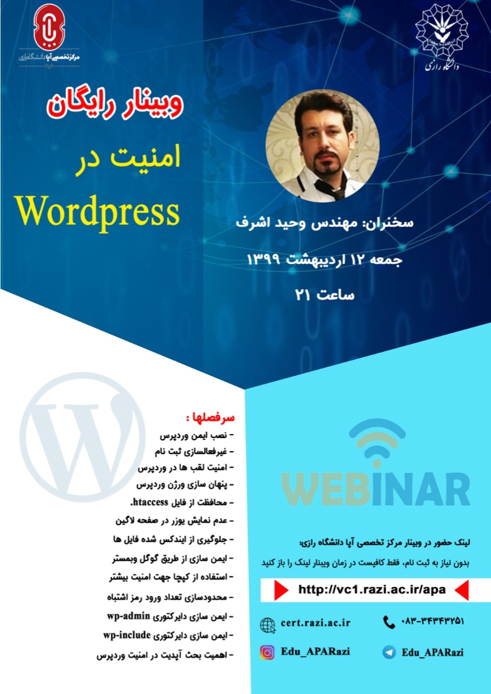 26 04 2020 786 برگزاری وبینار رایگان امنیت وبینار رایگان امنیت در Wordpress در روز جمعه مورخ 12 اردیبهشت ماه 1399 ساعت 21 برگزار میگردد. علاقمندان جهت شرکت در وبینار بدون نیاز به پیش ثبتنام در...