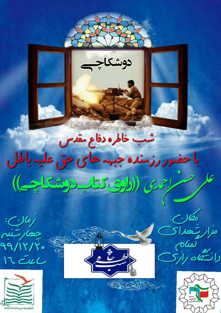 08 03 2021 1039 برگزاری مراسم «شب خاطره دفاع مقدس» 1399/12/20 مراسم «شب خاطره دفاع مقدس» توسط بسیج دانشجویی دانشگاه رازی ویژه عموم دانشگاهیان برگزار می گردد. با حضور رزمنده بسیجی علی حسن احمدی...