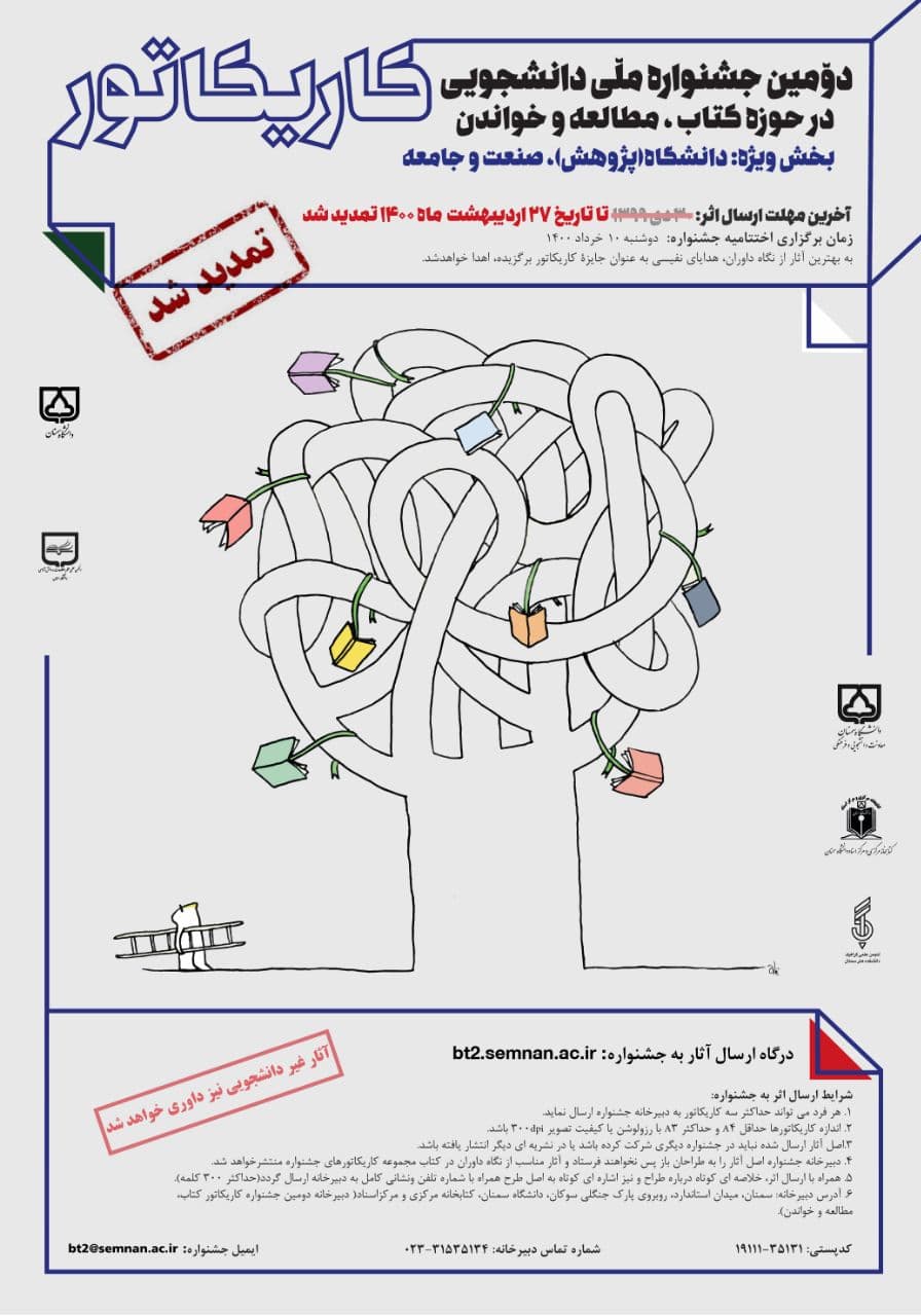 15 03 2021 881 فراخوان دومین جشنواره ملی دانشجویی کاریکاتور کتاب، مطالعه و خواندن 1400/02/27 انجمن های علمی دانشجویی علم اطلاعات و دانش شناسی و گروه ارتباط تصویری دانشگاه سمنان با همکاری کتابخانه...