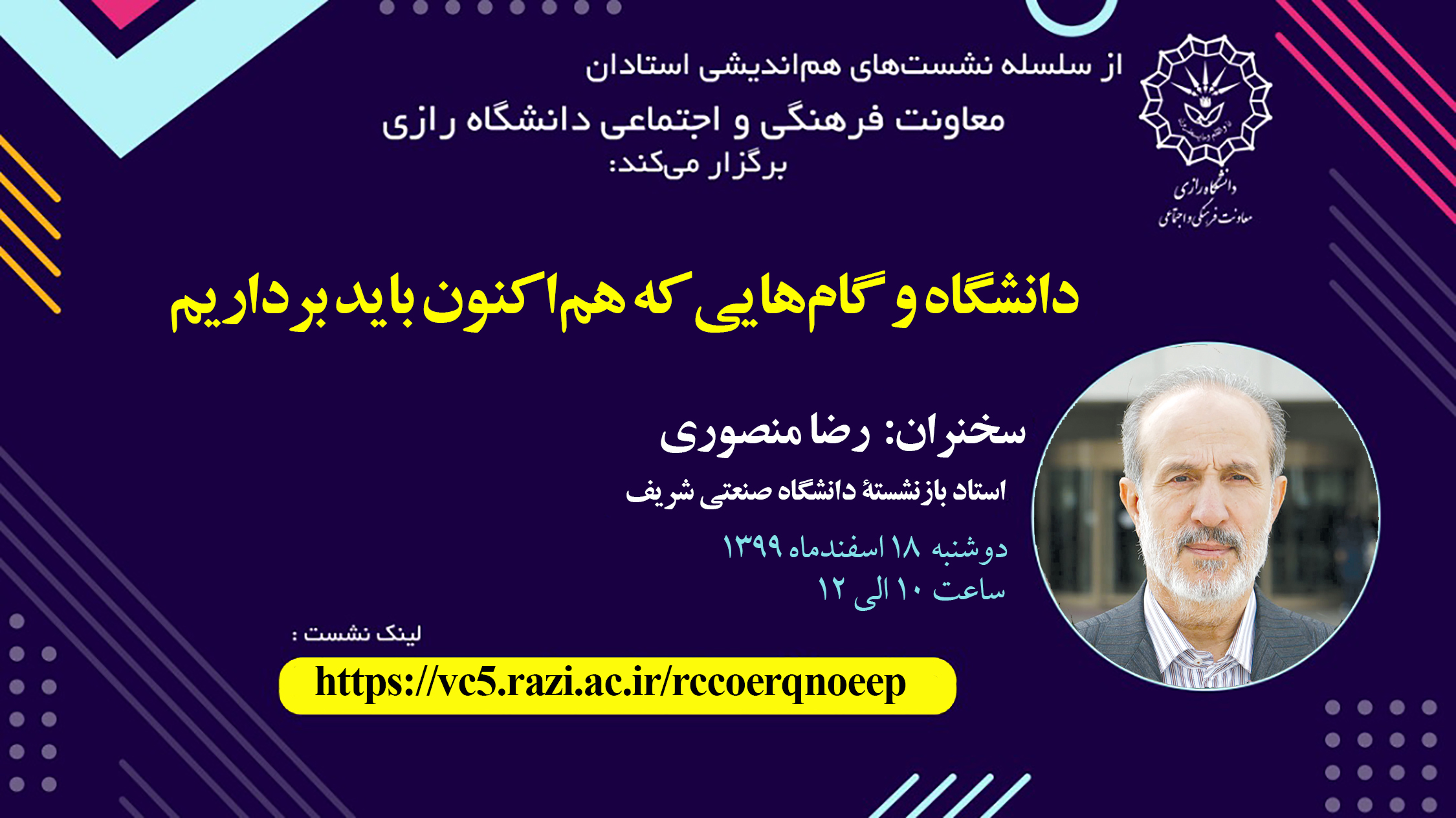 01 03 2021 734 نشست «دانشگاه و گامهاییکه هماکنون باید برداریم» ویژۀ استادان 1399/12/18 از سلسله نشستهای هماندیشی استادان دانشگاه رازی، جلسهای باعنوان «دانشگاه و گامهاییکه هماکنون باید...