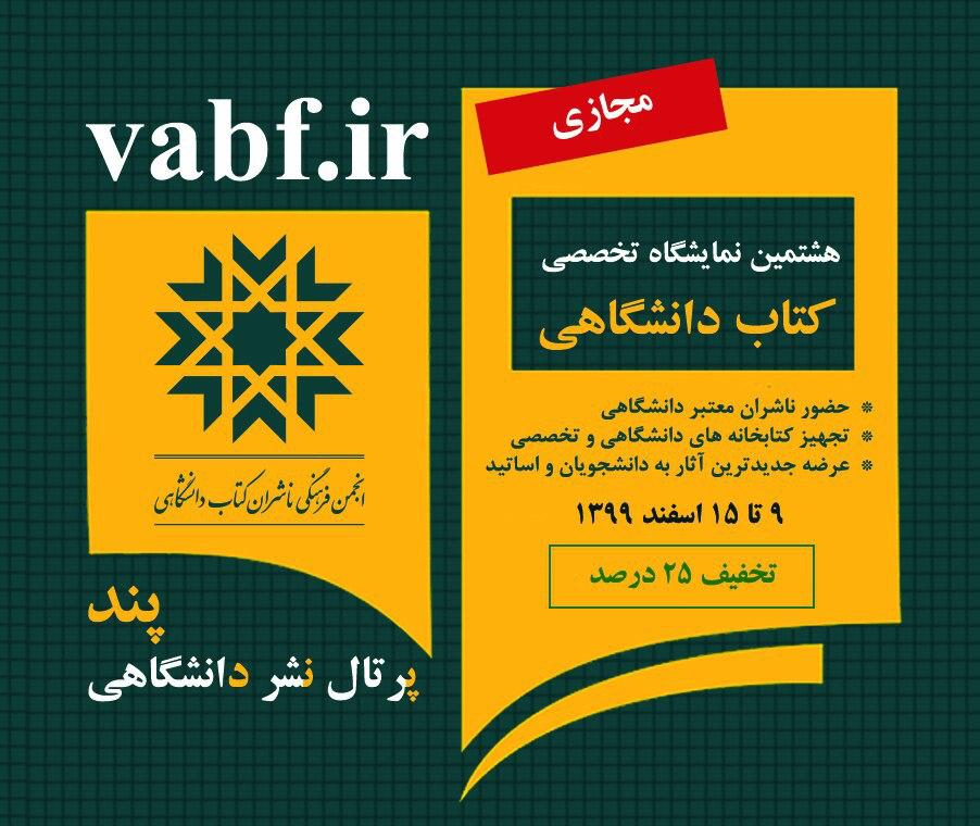 02 03 2021 710 برگزاری هشتمین نمایشگاه تخصصی کتاب دانشگاهی 1399/12/9-15 هشتمین نمایشگاه تخصصی کتاب دانشگاهی 9 تا 15 اسفند ماه به صورت مجازی برگزار می گردد. نشانی سایت: vabf.ir