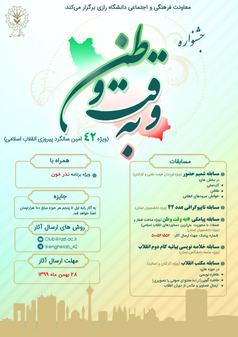 06 02 2021 582 جشنوارۀ استانی «به وقت وطن» ویژۀ جامعۀ دانشگاهی استان کرمانشاه 1399/11/28 معاونت فرهنگی و اجتماعی دانشگاه رازی به مناسبت گرامیداشت چهل و دومین سالگرد پیروزی انقلاب اسلامی، جشنوارۀ...