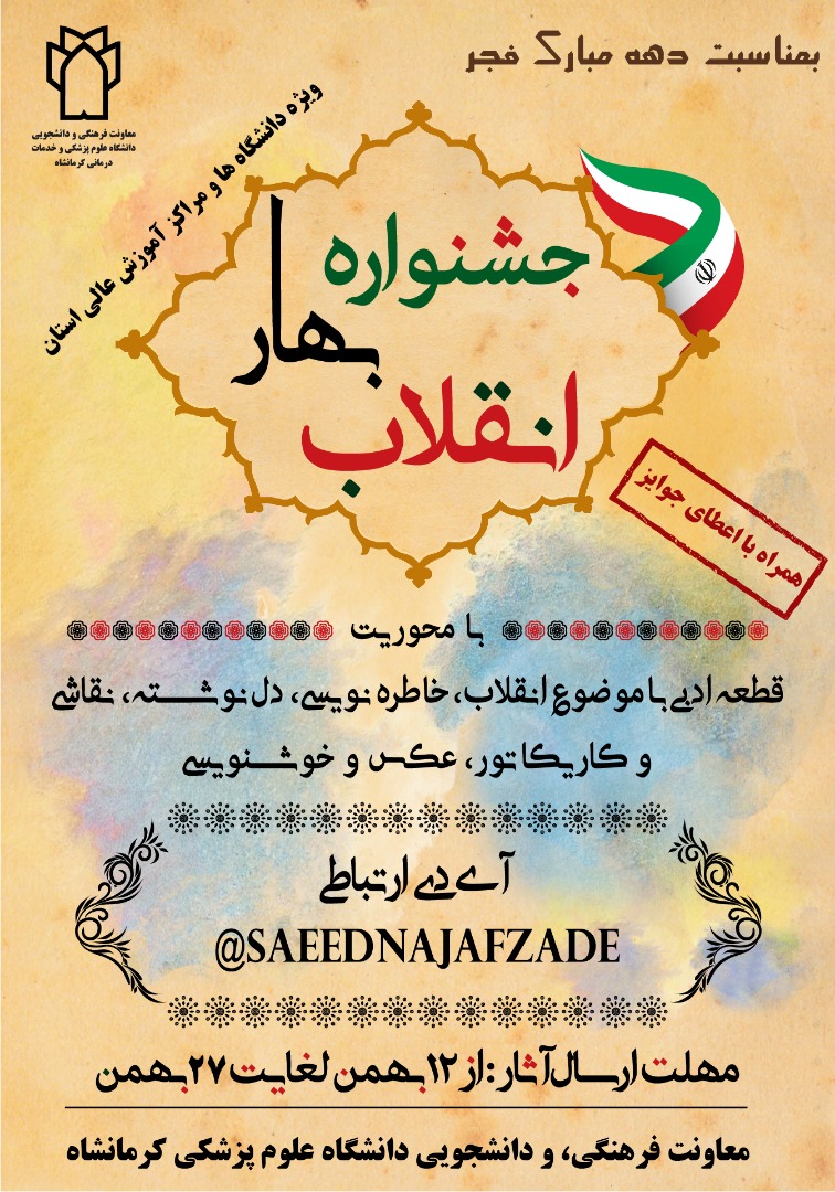 06 02 2021 842 جشنواره استانی «بهار انقلاب» 1399/11/27 دانشگاه علوم پزشکی کرمانشاه، جشنوارۀ استانی «بهار انقلاب» را ویژۀ دانشگاه ها و مراکز آموزش عالی استان کرمانشاه برگزار می نماید. با محوریت:...