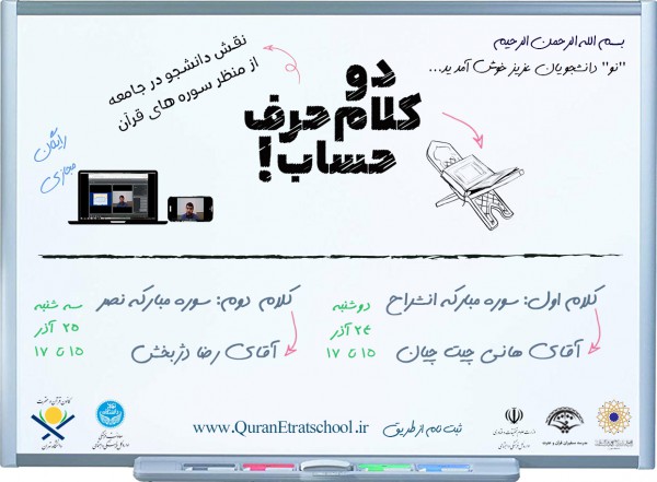14 12 2020 1089 دو کلام حرف حساب… مدرسه سفیران قرآن با همکاری کانون قرآن و عترت باشگاه دانشجویان دانشگاه تهران و اداره کل فرهنگی و اجتماعی وزارت علوم، تحقیقات و فناوری برگزار میکند: دو کلام حرف...