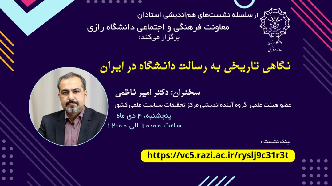 18 12 2020 519 جلسۀ هم اندیشی «نگاهی تاریخی به رسالت دانشگاه در ایران» ویژۀ استادان دانشگاه رازی 1399/10/04 معاونت فرهنگی و اجتماعی دانشگاه رازی جلسۀ هم اندیشی باعنوان «نگاهی تاریخی به رسالت...