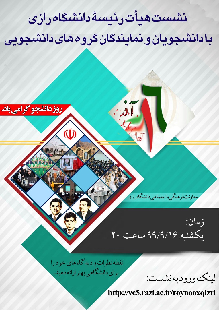 02 12 2020 498 نشست «هیأت رئیسۀ دانشگاه با دانشجویان و نمایندگان گروه های دانشجویی» 1399/9/16 معاونت فرهنگی و اجتماعی دانشگاه رازی به مناسبت گرامیداشت روز دانشجو، نشست «هیأت رئیسۀ دانشگاه با...