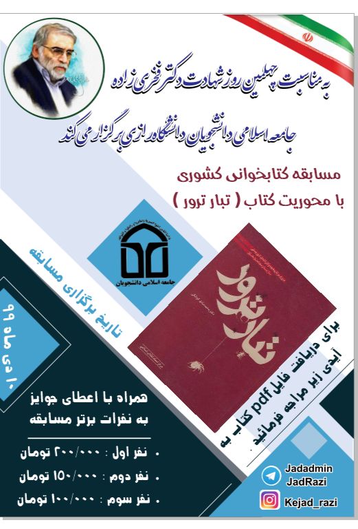 16 12 2020 615 مسابقه کتابخوانی "تبار ترور" 1399/10/10 جامعه اسلامی دانشجویان دانشگاه رازی کرمانشاه به مناسبت چهلمین روز شهادت شهید دکتر فخری زاده، مسابقه کتابخوانی «تبار ترور» را ویژۀ دانشجویان...