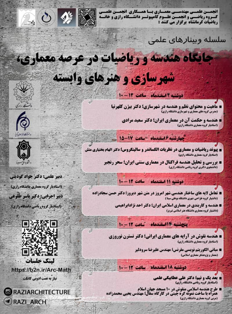 14 02 2021 980 سلسله وبینارهای علمی «جایگاه هندسه و ریاضیات در عرصۀ معماری، شهرسازی و هنرهای وابسته شهرسازی» 1399/12/4-18 انجمن علمی مهندسی معماری با همکاری انجمن های علمی دانشجویی ریاضی و علوم...