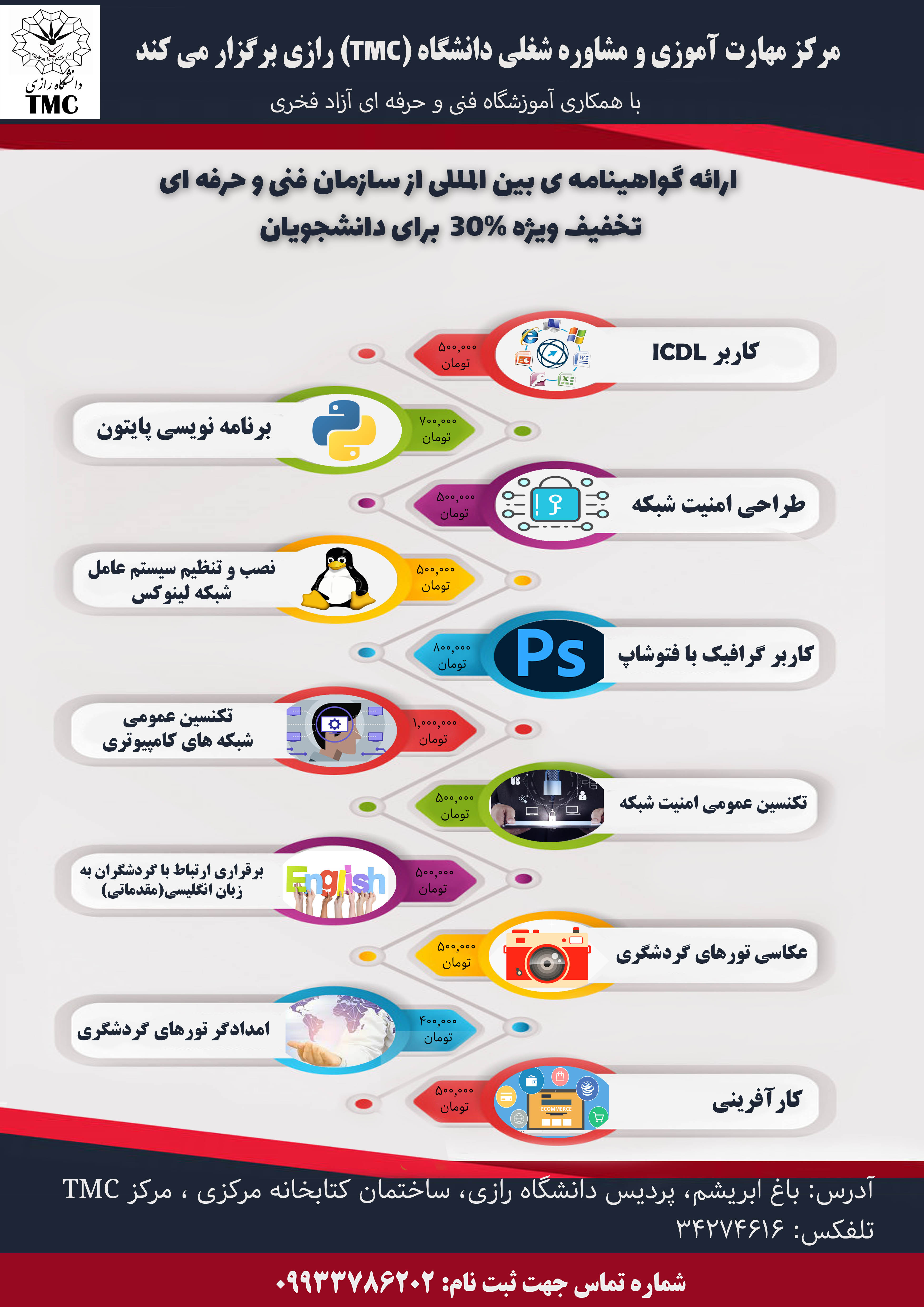05 12 2020 1496 فراخوان دورههای مرکز مهارت آموزی و مشاوره شغلی TMC دانشگاه رازی مرکز مهارت آموزی و مشاوره شغلی (TMC) دانشگاه رازی دوره های آموزشی را با ارائۀ گواهینامۀ بین المللی از سازمان فنی و...