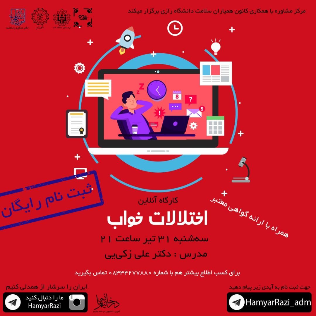 19 07 2020 522 برگزاری کارگاه آموزشی اختلالات خواب 99/4/31 کانون همیاران سلامت و مرکز مشاوره دانشگاه، کارگاه های آنلاین توانمند سازی دانشجویان را برگزار میکنند. عنوان کارگاه: اختلالات خواب تاریخ:...