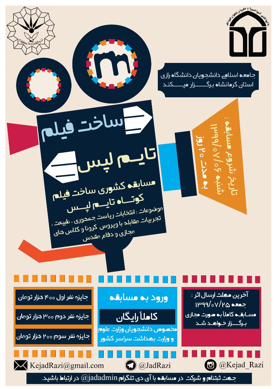 27 09 2020 616 برگزاری مسابقه کشوری ساخت فیلم کوتاه تایم لپس 1399/7/25 جامعه اسلامی دانشجویان دانشگاه رازی مسابقه ساخت فیلم کوتاه تایم لپس با موضوعات مختلف را به صورت کشوری برگزار می کند: شرکت در...