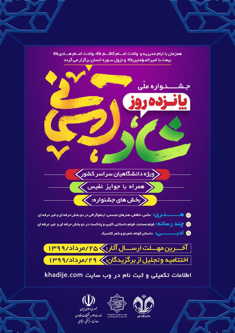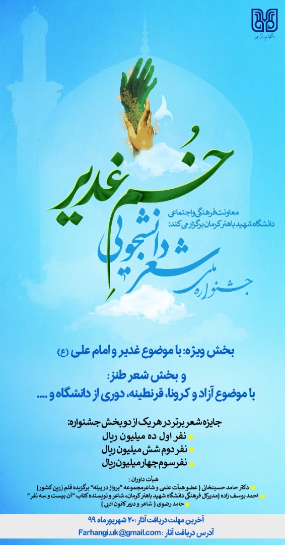 11 08 2020 1102 فراخوان جشنواره ملی شعر دانشجویی غدیر خم 1399/6/20 معاونت فرهنگی و اجتماعی دانشگاه شهید باهنر کرمان «جشنواره ملی شعر دانشجویی غدیر خم» را برگزار میکند. بخش ویژه: با موضوع غدیر و...