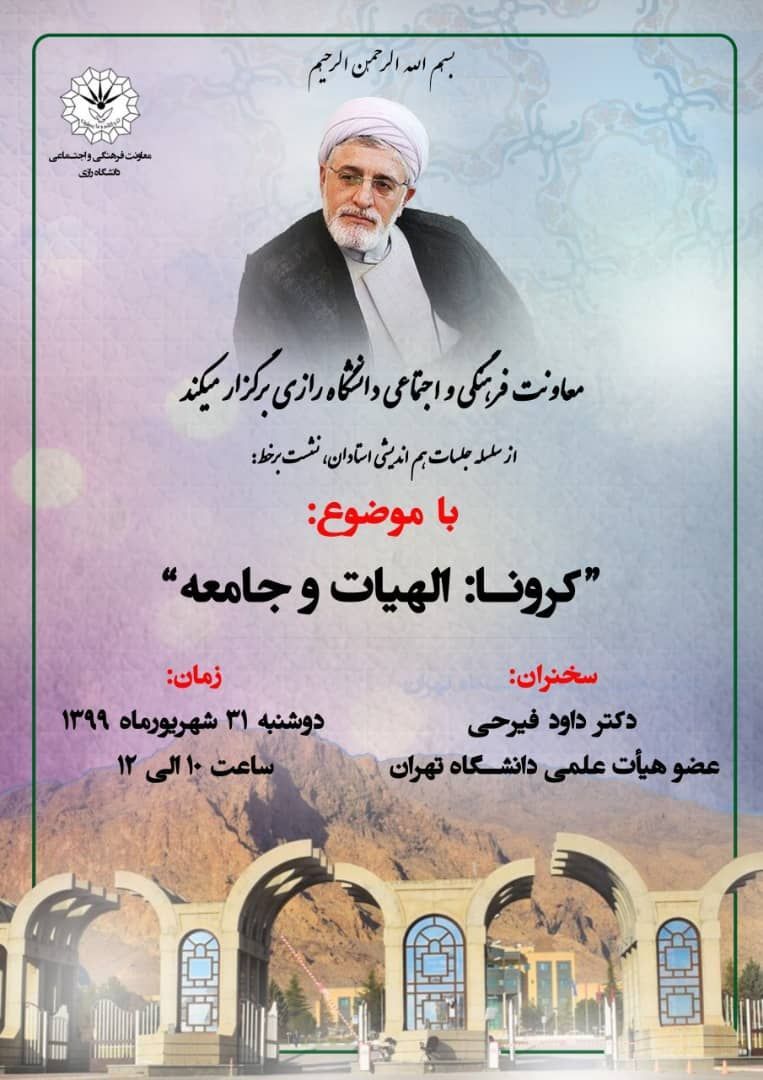 15 09 2020 479 نشست برخط «کرونا: الهیات و جامعه» ویژه اساتید دانشگاه رازی 99/6/31 معاونت فرهنگی و اجتماعی دانشگاه رازی، از سلسله جلسات هم اندیشی استادان، نشست برخط «کرونا: الهیات و جامعه» را برگزار...