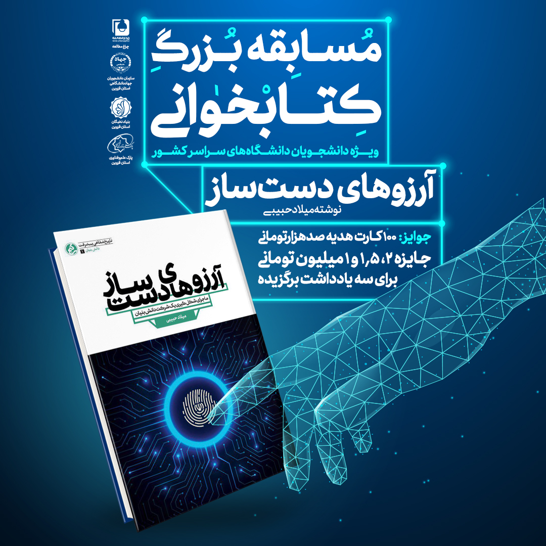 10 08 2020 708 فراخوان مسابقۀ کتابخوانی «آرزوهای دست ساز» 99/6/31 جهاد دانشگاهی استان قزوین با همکاری پارک علم و فناوری و بنیاد ملی نخبگان استان، مسابقه کتابخوانی «آرزوهای دست ساز» را ویژۀ...