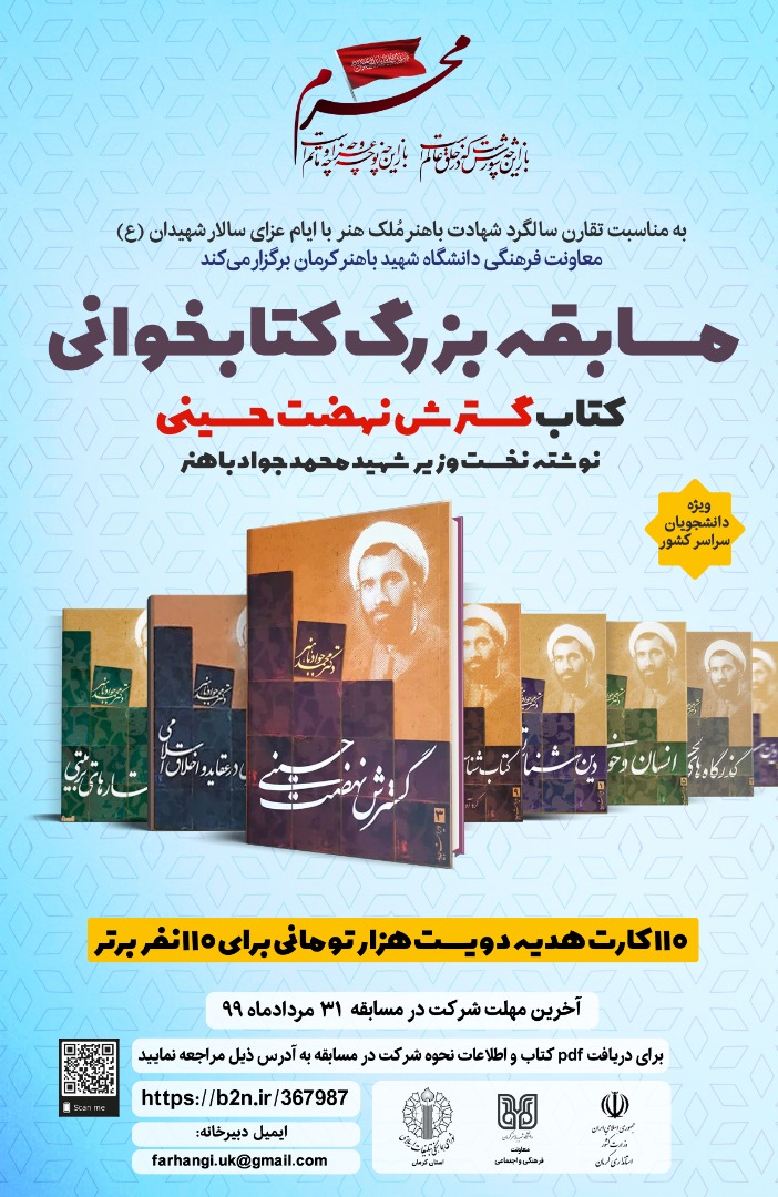 11 08 2020 1275 مسابقه بزرگ کتابخوانی کتاب «گسترش نهضت حسینی» 1399/6/10 معاونت فرهنگی دانشگاه شهید باهنر کرمان به مناسبت سالگرد شهادت باهنر، مسابقه بزرگ کتابخوانی کتاب «گسترش نهضت حسینی» نوشته...