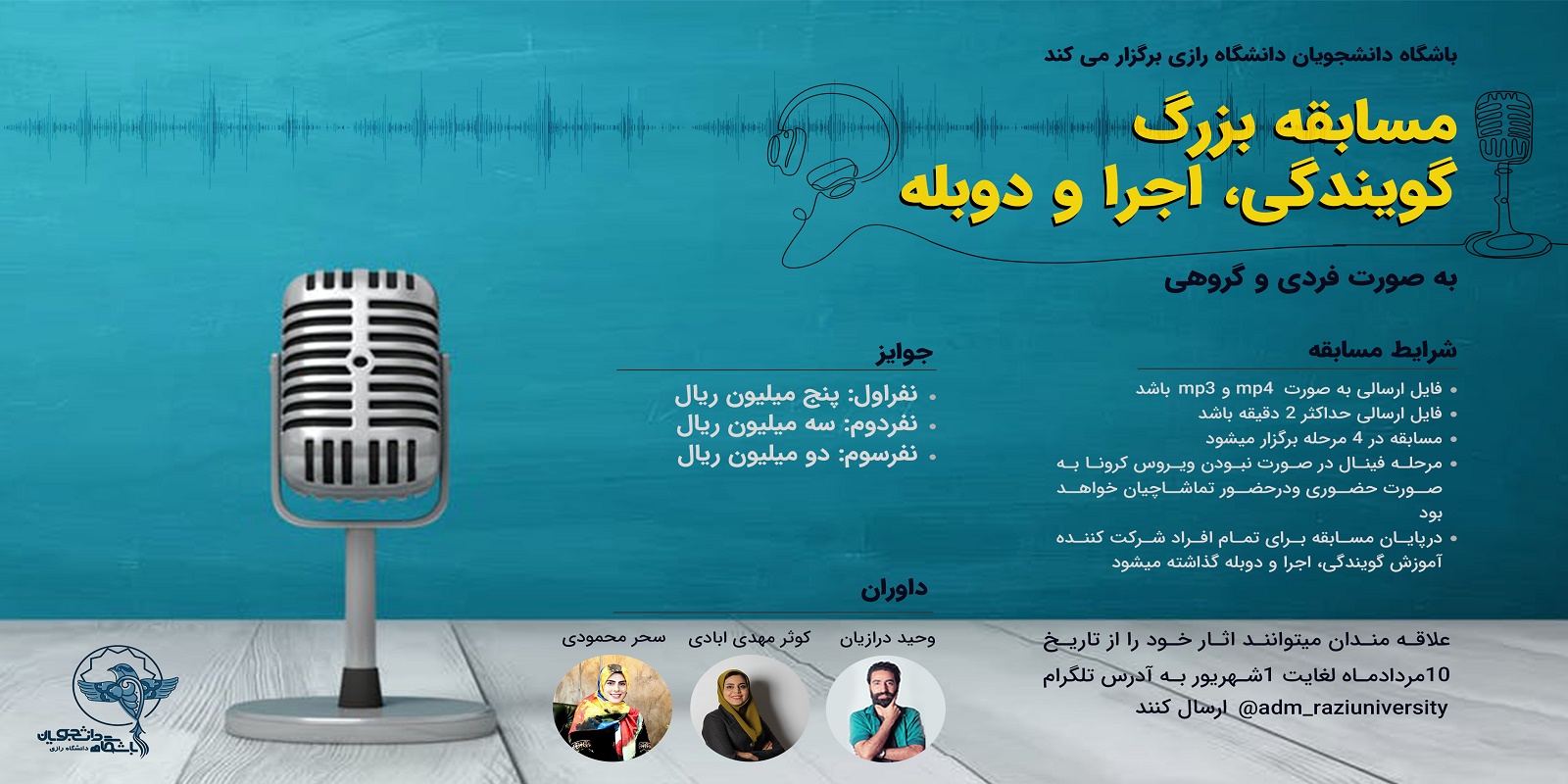 16 08 2020 1521 برگزاری مسابقه بزرگ گویندگی، اجرا و دوبله 1399/6/1 باشگاه دانشجویان دانشگاه رازی، «مسابقه بزرگ گویندگی، اجرا و دوبله» را به صورت فردی و گروهی برگزار میکند. -جوایز برگزیدگان: نفر...