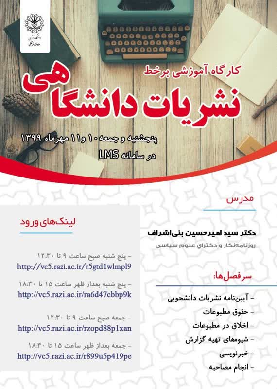 26 09 2020 551 برگزاری کارگاه آموزشی برخط «نشریات دانشگاهی» 1399/7/11 معاونت فرهنگی اجتماعی دانشگاه رازی کارگاه آموزشی برخط «نشریات دانشگاهی» را در سامانه LMS برگزار می کند: مدرس: دکتر سید امیرحسین...