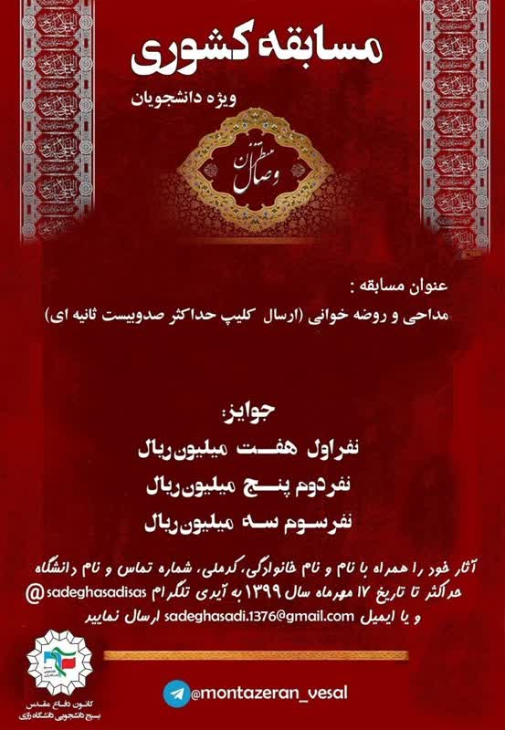 26 09 2020 727 برگزاری مسابقه «منتظران وصال» با موضوع مداحی و روضه خوانی 1399/7/17 بسیج دانشجویی دانشگاه رازی مسابقه «منتظران وصال» را با موضوع مداحی و روضه خوانی به مناسبت اربعین حسینی(ع) ویژه...