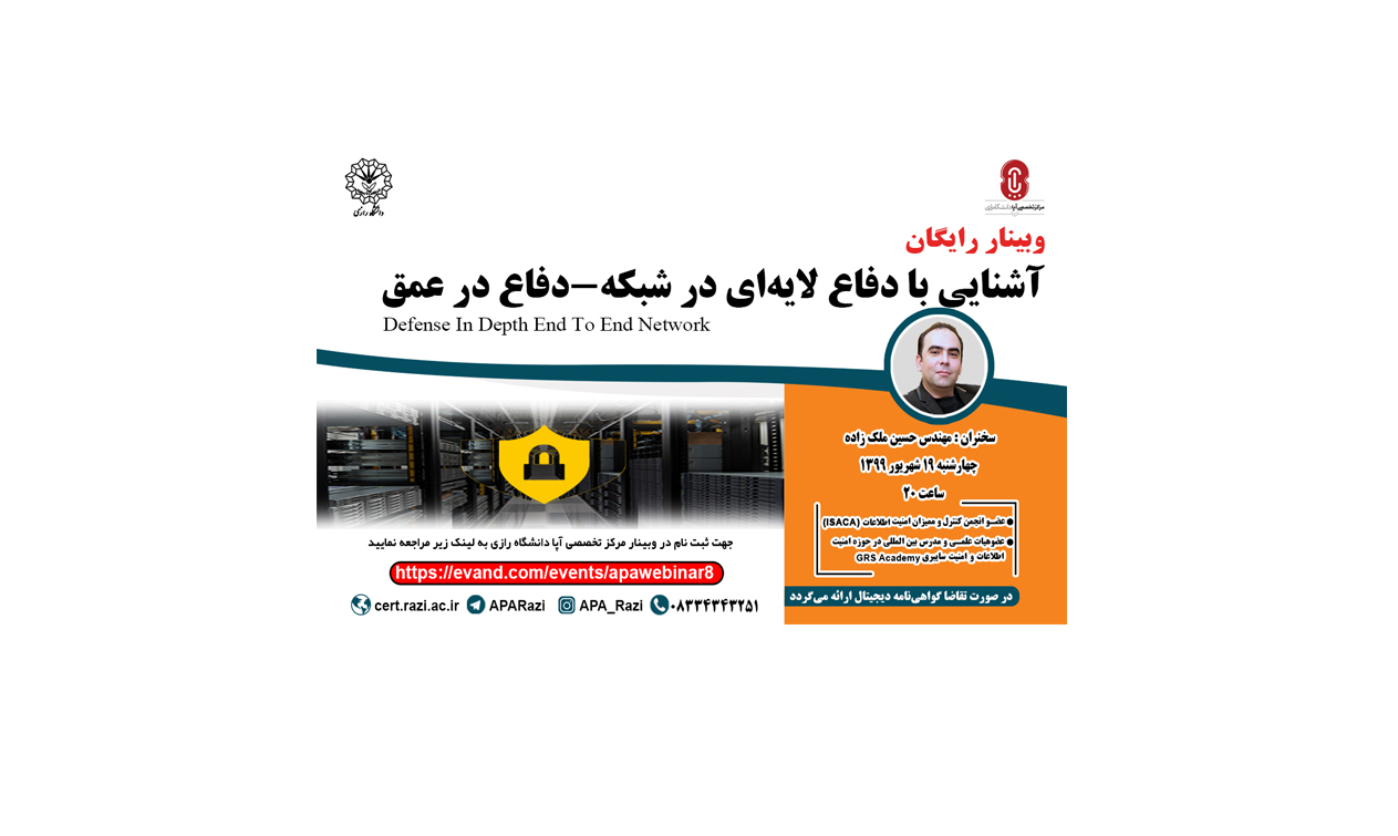 01 09 2020 418 ثبت نام وبینار رایگان دفاع لایهای در شبکه- دفاع در عمق 1399/6/19 ثبت نام وبینار رایگان دفاع لایهای در شبکه- دفاع در عمق، مرکز تخصصی آپا دانشگاه رازی آغاز گردید. علاقهمندان...