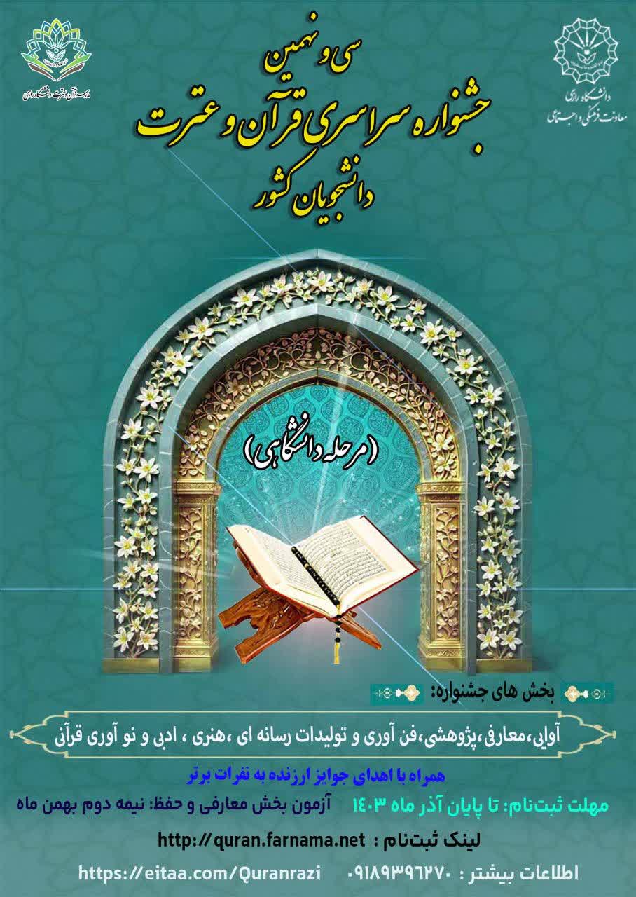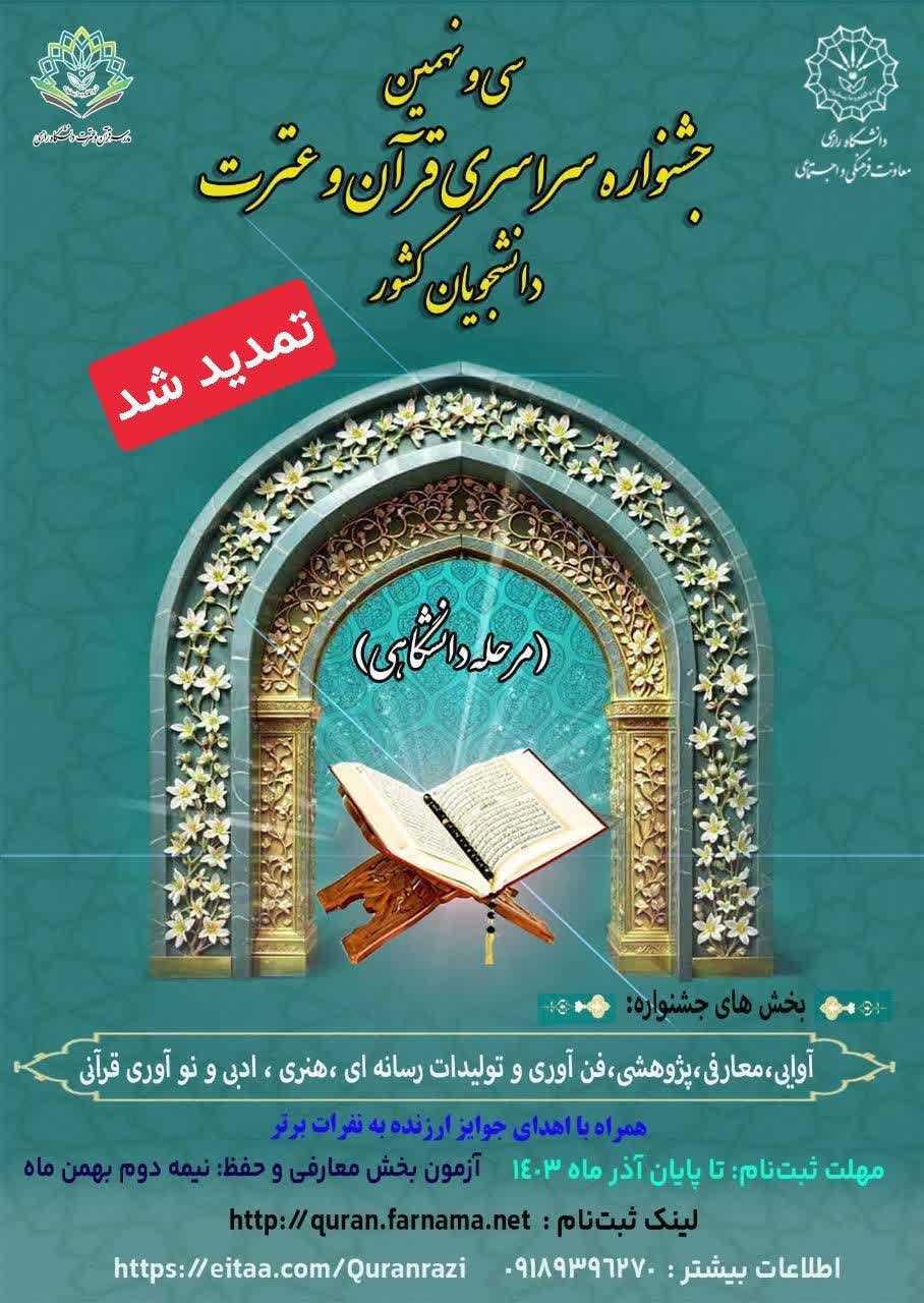 824 مرحله دانشگاهی تمدید مهلت ثبتنام سی و نهمین جشنوارهٔ سراسری قرآن و عترت دانشجویان کشور بخشهای جشنواره: بخش آوایی شامل: رشتههای قرائت تحقیق، قرائت ترتیل، حفظ پنج جزء، حفظ ۱۰ جزء، حفظ ۲۰...