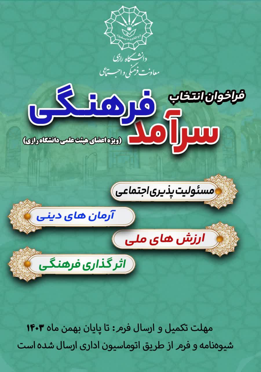 940 فراخوان انتخاب سرآمد فرهنگی (اعضای هیأت علمی) معاونت فرهنگی و اجتماعی دانشگاه رازی فرآیند انتخاب سرآمدان و استاد نمونه فرهنگی اعضای هیأت علمی را آغاز نموده است. مراحل شرکت در این فرآیند به شرح...