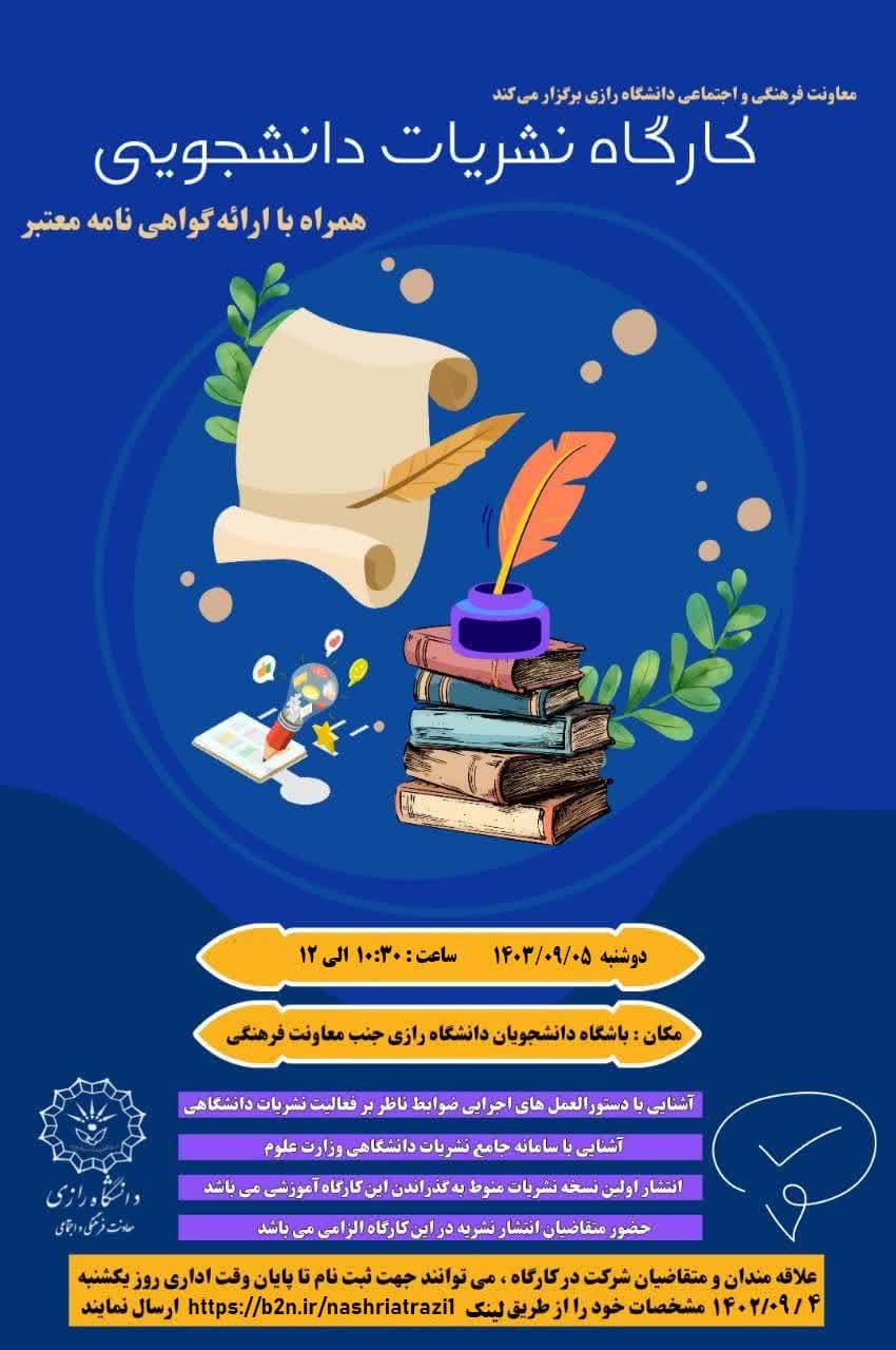528 کارگاه آموزشی «نشریات دانشجویی» زمان برگزاری: دوشنبه 1403/09/05 ساعت 10 تا 12 مکان: پردیس دانشگاه رازی، جنب درمانگاه، باشگاه دانشجویان آشنایی با دستورالعملهای اجرایی ضوابط ناظر بر فعالیت...