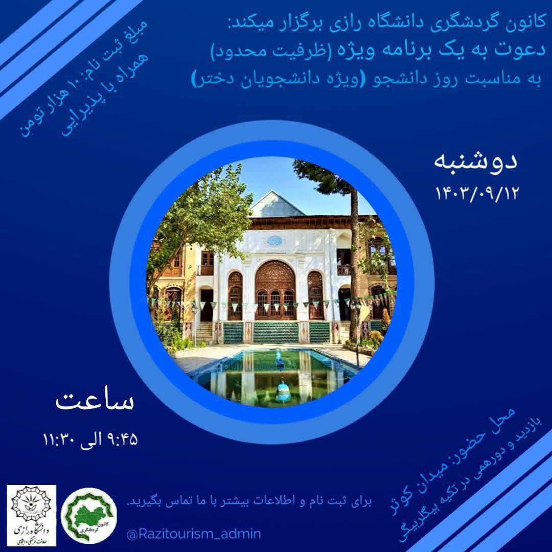 445 کانون گردشگری دانشگاه رازی برگزار میکند: بازدید از مکان تاریخی فرهنگی بیگلربیگی دعوت به یک برنامه ویژه به مناسبت روز دانشجو ظرفیت محدود ویژه همه دانشجویان دختر زمان: دوشنبه ۹.۱۲ ساعت...