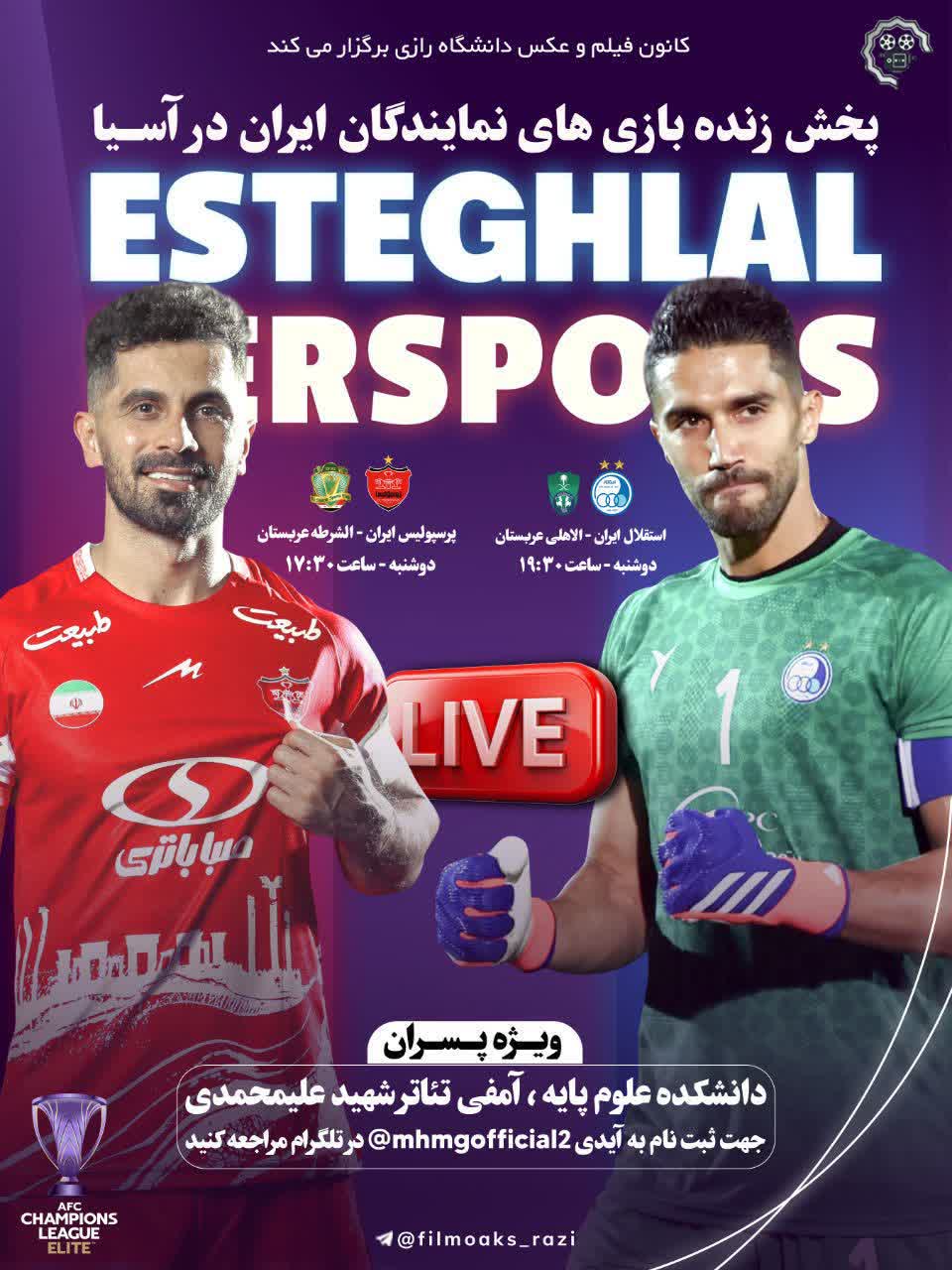 372 کانون فیلم و عکس دانشگاه رازی برگزار میکند: پخش زنده بازیهای نمایندگان ایران در آسیا دانشکده علوم پایه دوشنبه ۱۲ آذر ۱۴۰۳ آمفی تئاترشهید علیمحمدی پرسپولیس ایران - الشرطه عراق ساعت ۱۷:۳۰...