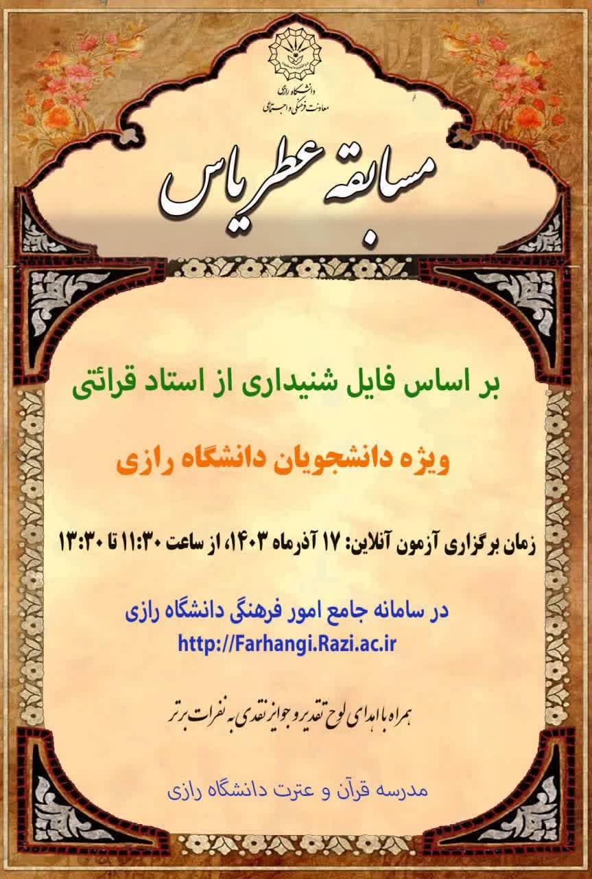 875 مدرسه قرآن و عترت دانشگاه رازی برگزار مینماید: مسابقه عطر یاس بهمناسبت ایّام فاطمیه، مسابقه «عطر یاس» بر اساس فایلهای شنیداری از استاد قرائتی برگزار میگردد. ویژه دانشجویان دانشگاه رازی ...