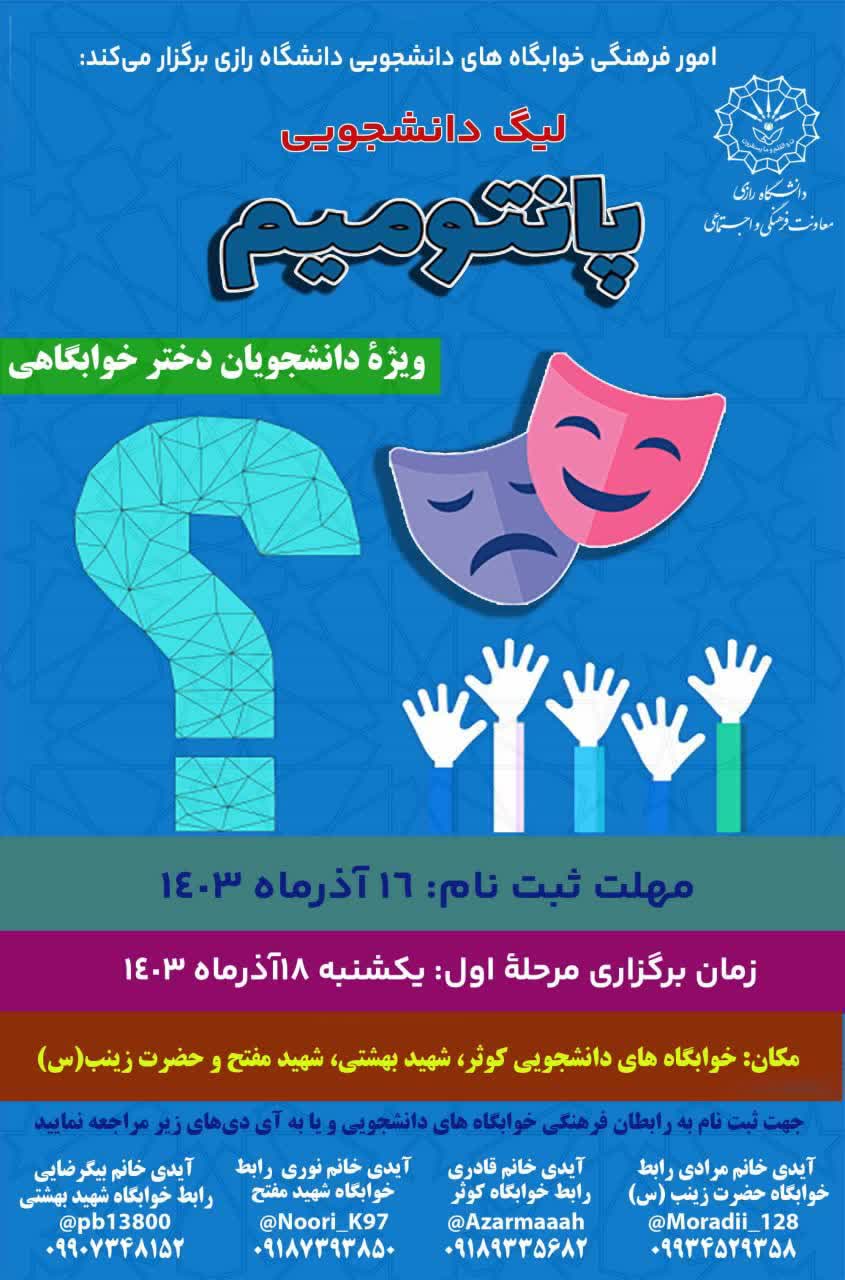 711 امور فرهنگی خوابگاههای دانشجویی دانشگاه رازی برگزار میکند: لیگ دانشجویی پانتومیم ویژۀ دانشجویان دختر خوابگاهی به صورت تیمی مهلت ثبت نام: ۱۶ آذرماه ۱۴۰۳ زمان برگزاری مرحلۀ اول: یکشنبه ۱۸...