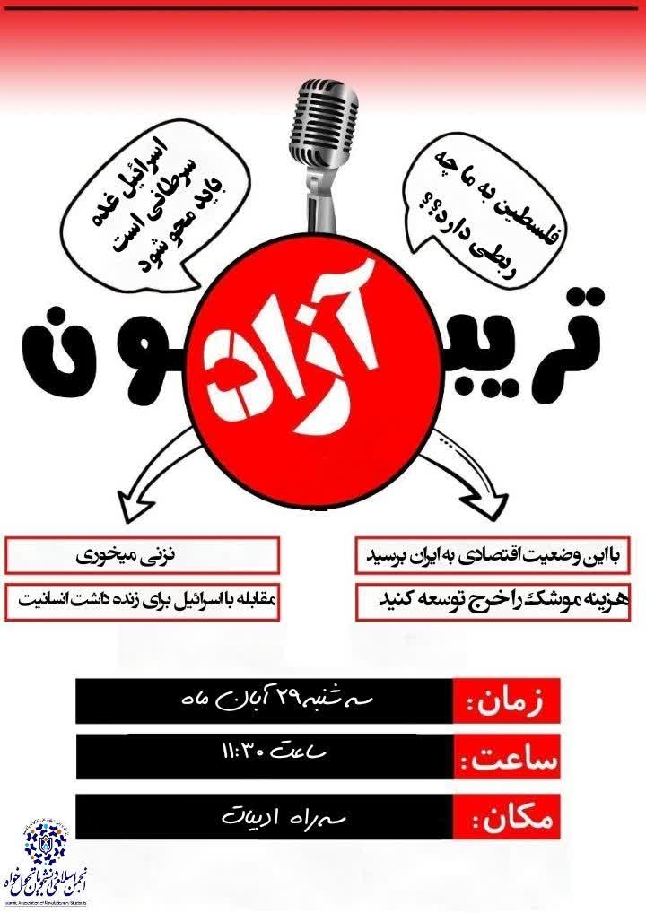 374 تریبون آزاد دانشجویی «ویژه قضایای فلسطین» فلسطین به ما چه ربطی دارد ؟؟ اسرائیل غده سرطانی است باید محو شود دعوت از تمامی دانشجویان عزیزان زمان:۲۹ آبان ماه ساعت ۱۱/۳۰ مکان: سه راه دانشکدۀ...