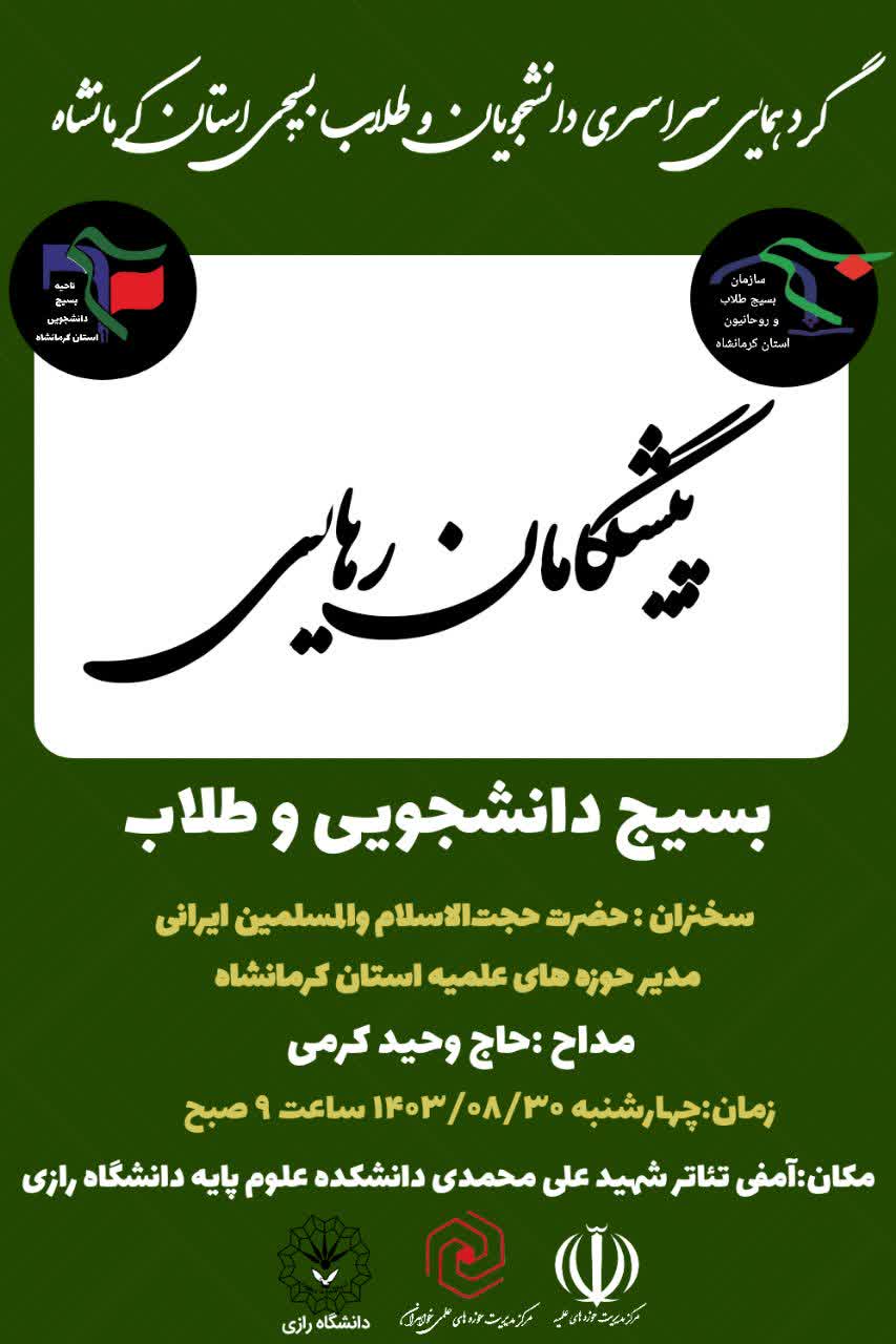 332 گردهمایی سراسری دانشجویان و طلاب بسیجی استان کرمانشاه «پیشگامان رهایی بسیج دانشجویی و طلاب سخنران: حجتالاسلاموالمسلمین ایرانی مدیر حوزههای علمیه استان کرمانشاه مداح: حاج وحید کرمی زمان:...