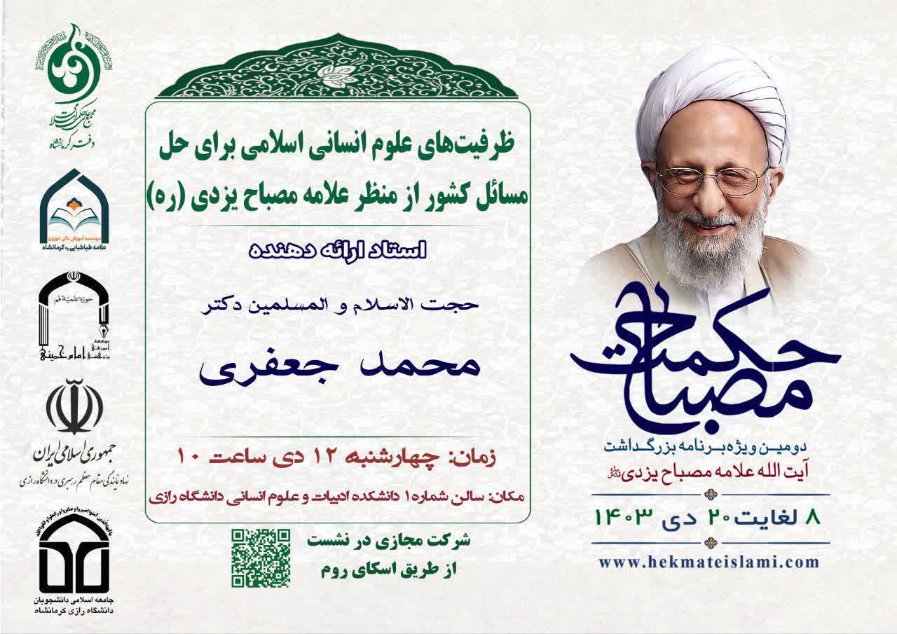 762 جامعه اسلامی دانشجویان دانشگاه رازی کرمانشاه برگزار می کند: نشست بررسی «ظرفیتهای علوم انسانی برای حل مسائل کشور از منظر علامه مصباح یزدی(ره)» سخنران: حجتالاسلام والمسلمین دکتر محمد جعفری...