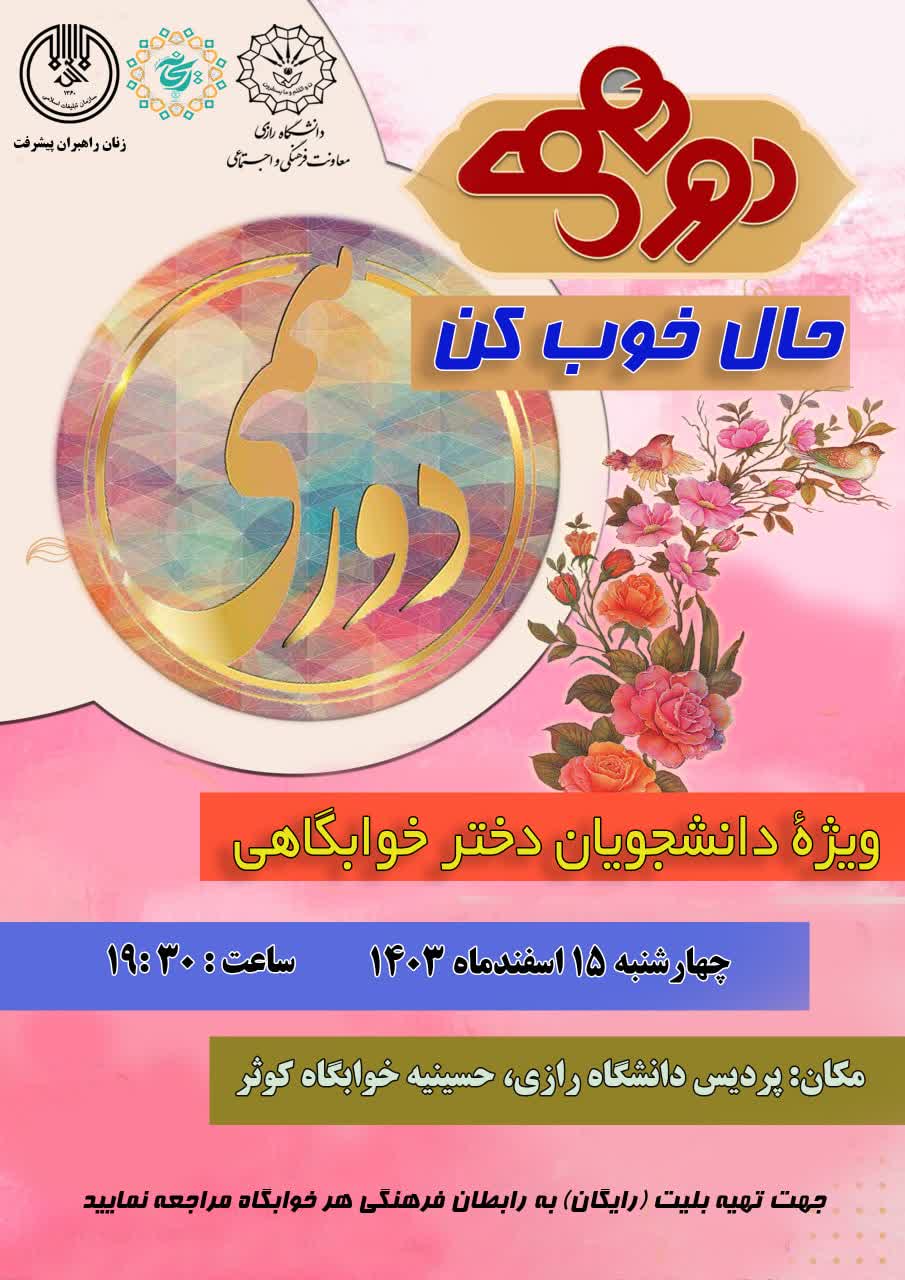 387 دورهمی حال خوب کن ویژۀ دانشجویان دختر خوابگاهی باحضور: دکتر محمّدسجاد صیدی عضو هیأت علمی گروه راهنمایی و مشاوره دانشگاه رازی زمان: چهارشنبه ۱۵ اسفندماه ساعت ۱۹:۳۰ مکان: پردیس دانشگاه رازی،...