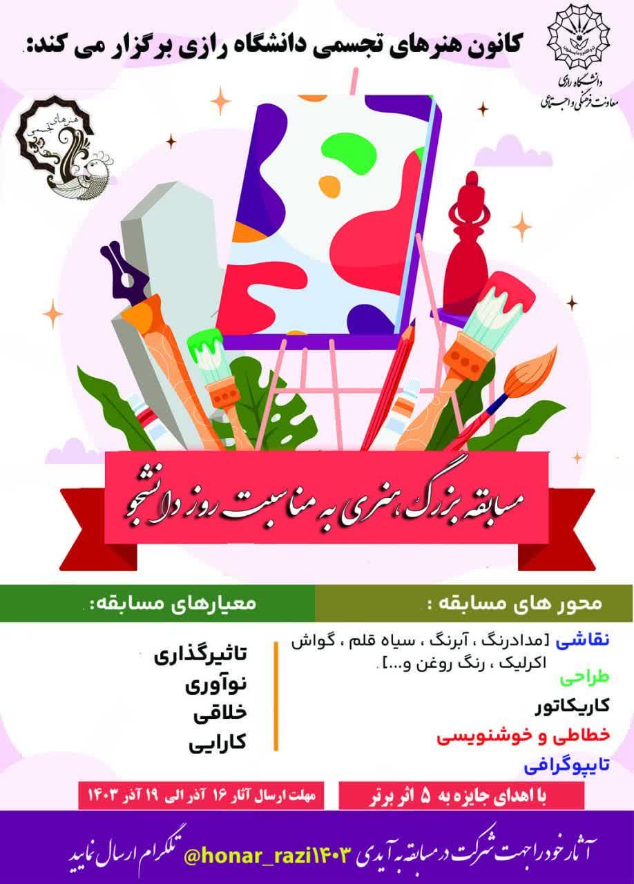 853 کانون هنرهای تجسمی دانشگاه رازی برگزار می کند: مسابقه بزرگ هنری به مناسبت روز دانشجو محورهای مسابقه: نقاشی[مدادرنگ ، آبرنگ ، سیاه قلم ، گواش ، اکرلیک ، رنگ روغن و...] طراحی کاریکاتور خطاطی و...