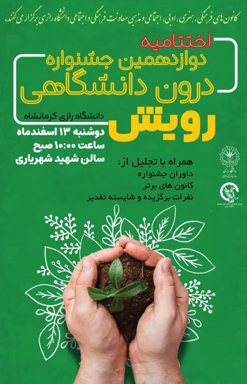 351 کانون های فرهنگی، هنری، ادبی، اجتماعی و مذهبی معاونت فرهنگی و اجتماعی دانشگاه رازی برگزار میکنند: مراسم اختتامیه دوازدهمین جشنواره دانشگاهی رویش و تقدیر از استعداد های برتر فرهنگی، هنری،...