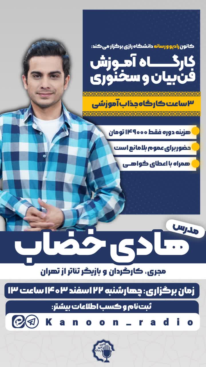 422 کانون رادیو و رسانه دانشگاه رازی برگزار میکند: کارگاه آموزش فنبیان و سخنوری اگر به مهارت فنبیان جهت ارائه، کنفرانس، تدریس، ارتباط موثر، اجرا و گویندگی علاقمندید: این فرصت استثنایی و...