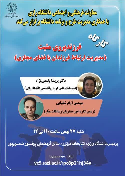 541 معاونت فرهنگی و اجتماعی دانشگاه رازی باهمکاری مدیریت طرح و برنامه دانشگاه برگزار میکند: کارگاه آموزشی فرزندپروری مثبت (مدیریت ارتباط فرزندان با فضای مجازی) مدرس: دکتر پریسا یاسمی نژاد عضو...