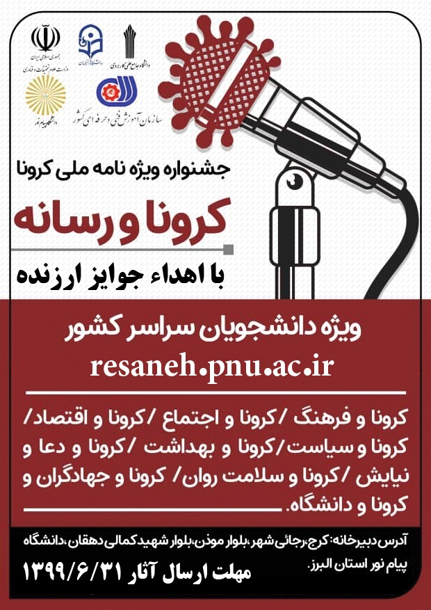 26 05 2020 346 برگزاری جشنوارۀ ویژه نامۀ «کرونا و رسانه» اداره کل فرهنگی و اجتماعی وزارت علوم، تحقیقات و فناوری با همکاری معاونت فرهنگی، اجتماعی و دانشجویی دانشگاه پیام نور، جشنواره ای با عنوان...