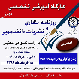 05 06 2020 461 تمدید زمان کارگاه آموزشی برخط «روزنامه نگاری و نشریات دانشجویی» 99/3/19 معاونت فرهنگی و اجتماعی دانشگاه رازی به منظور توانمندسازی نشریات، کارگاه آموزشی برخط «روزنامه نگاری و نشریات...