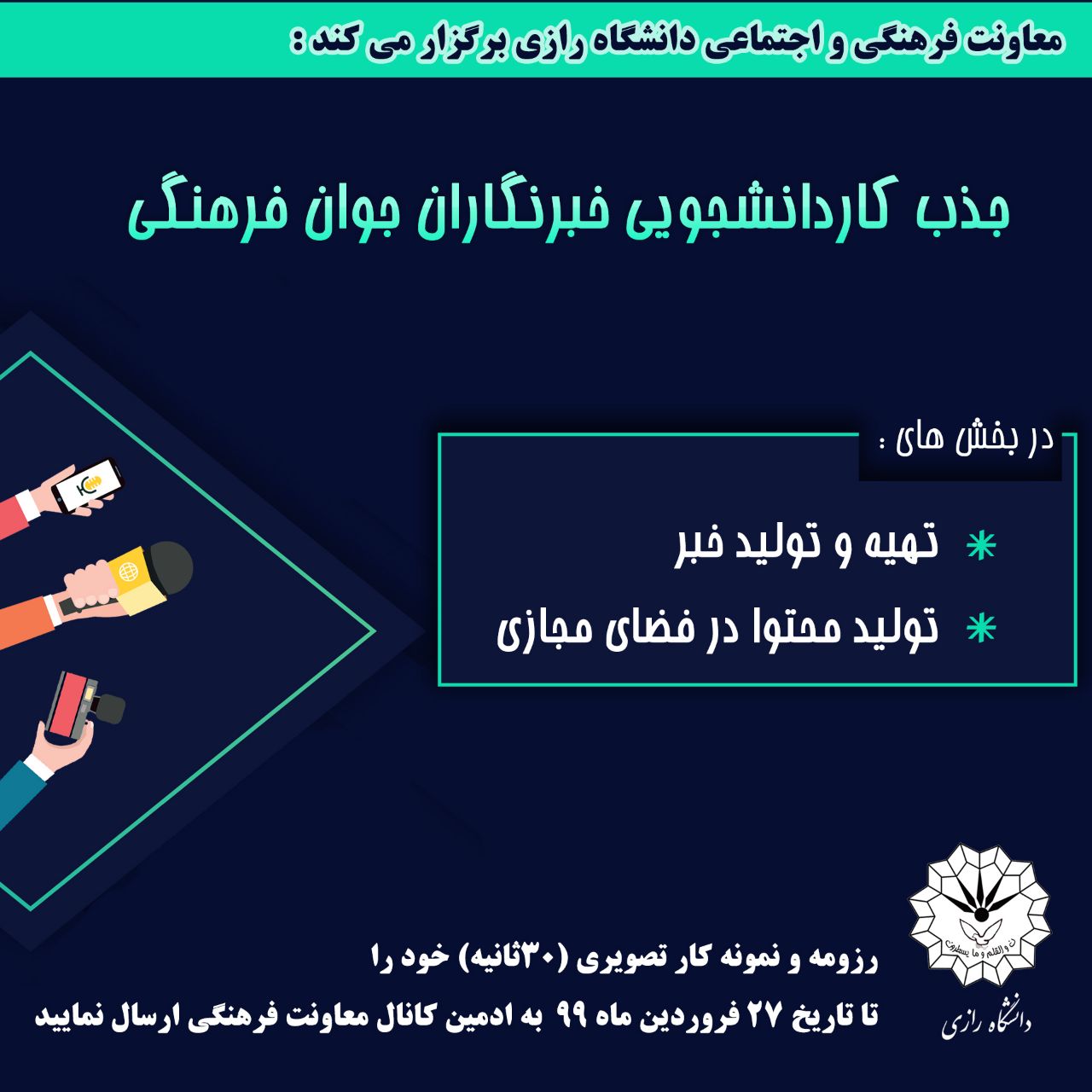 1054 جذب کار دانشجویی خبرنگاران جوان فرهنگی معاونت فرهنگی و اجنماعی دانشگاه رازی در نظر دارد از میان علاقمندان، خبرنگاران فرهنگی را در زمینه های: تهیه و تولید خبر فرهنگی و نیز تولید محتوا در فضای...